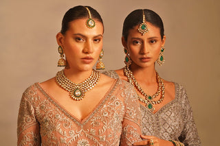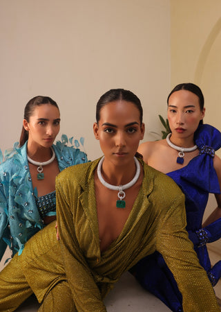 “Two expressions of timeless elegance: the Helena Choker in emerald green and in ruby pink. Sleek CZ bands meet regal gemstones, creating jewels that whisper grace yet radiate unmistakable power.”