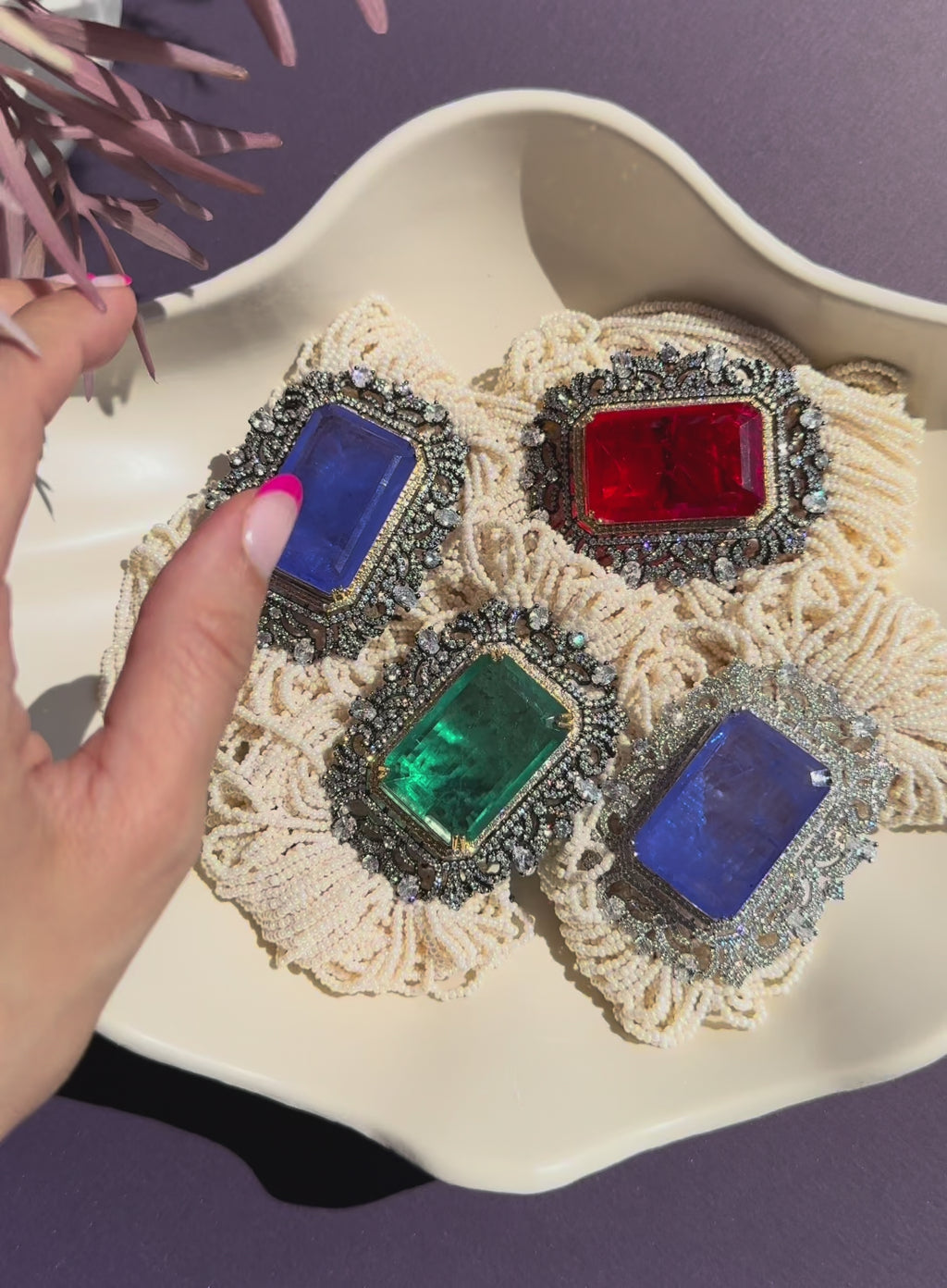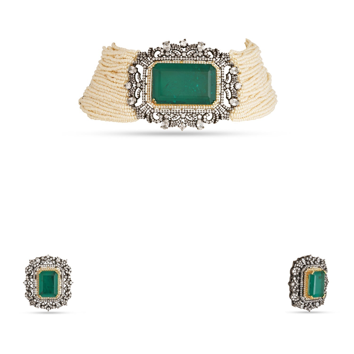 Take your festive look to the next level with Elyanna, an exquisite choker set featuring multiple strings of luscious white pearls and a stunning emerald green doublet pendant. Complete the look with matching earrings for a touch of elegance and charm.