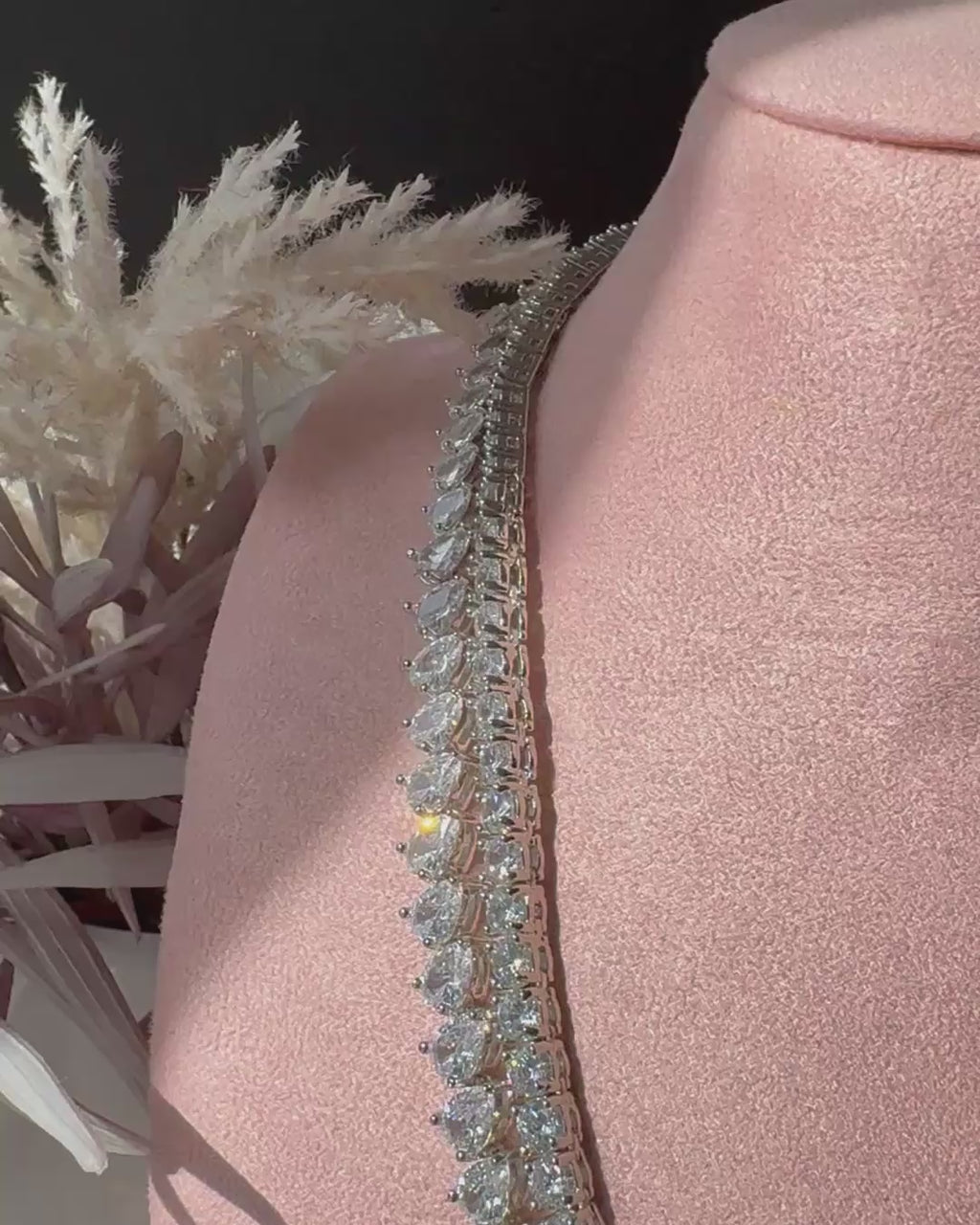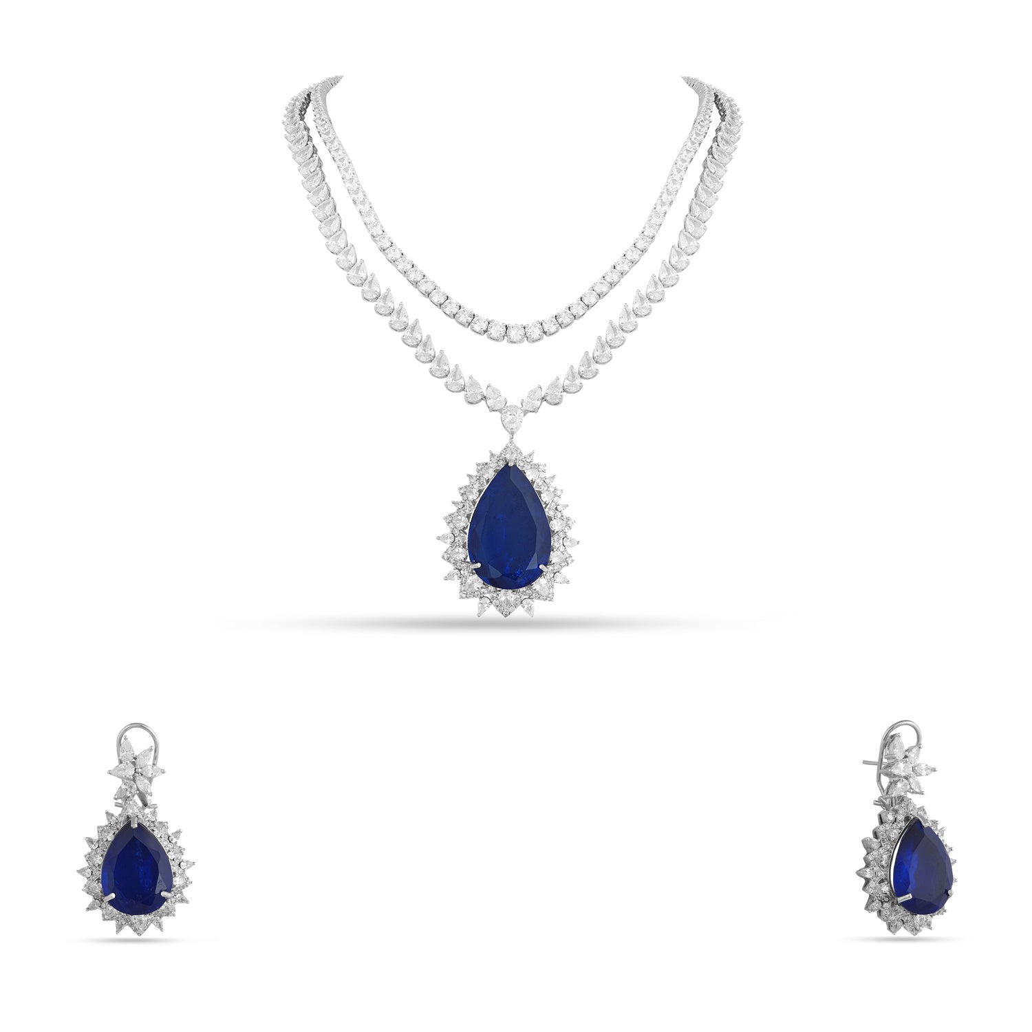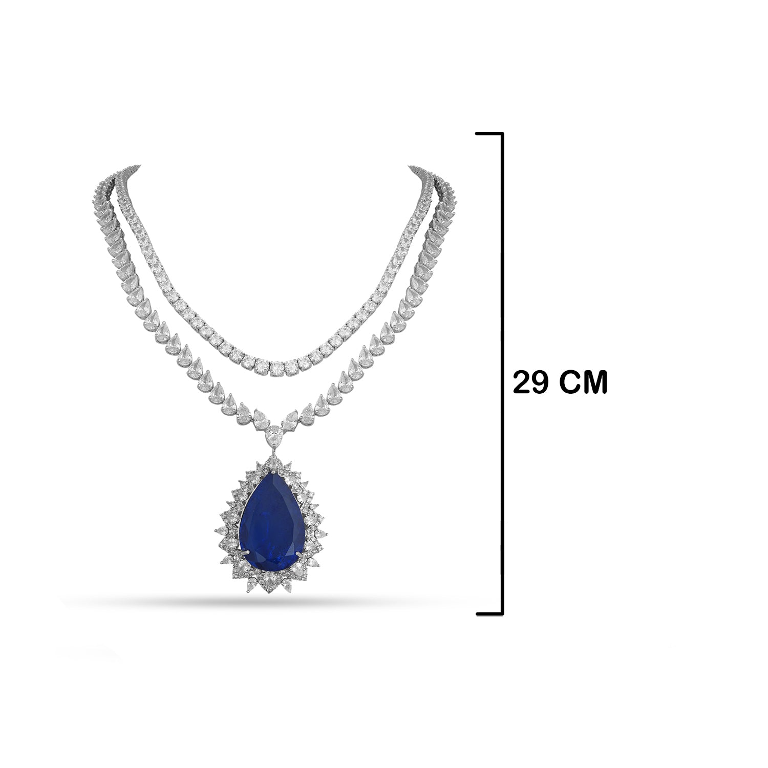 Elevate your style with Laiba - a dazzling double layered cubic zirconia necklace, adorned with a mesmerizing sapphire blue stone pendant. Indulge in luxe beauty and make a statement with this must-have set.