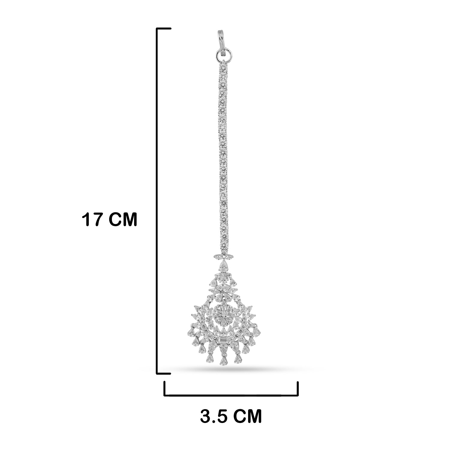 Add some sparkle to your look with the Fakhirah Maang Tikka! This silver-finished piece is adorned with gorgeous American diamonds.