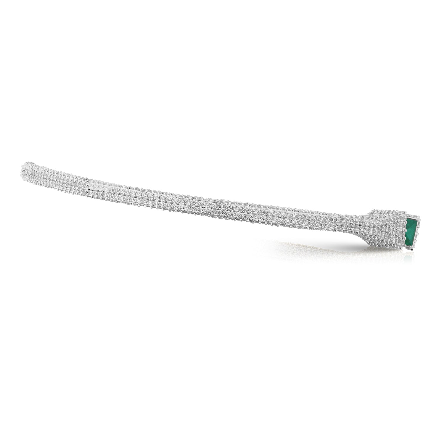 A design that draws its strength from symmetry and balance, the Astrid Choker is a poetic interplay of light and geometry. The squared emerald-green stones, framed with a delicate halo of CZ, anchor the necklace with quiet authority, while pavé-set bands embrace the neckline in fluid brilliance.