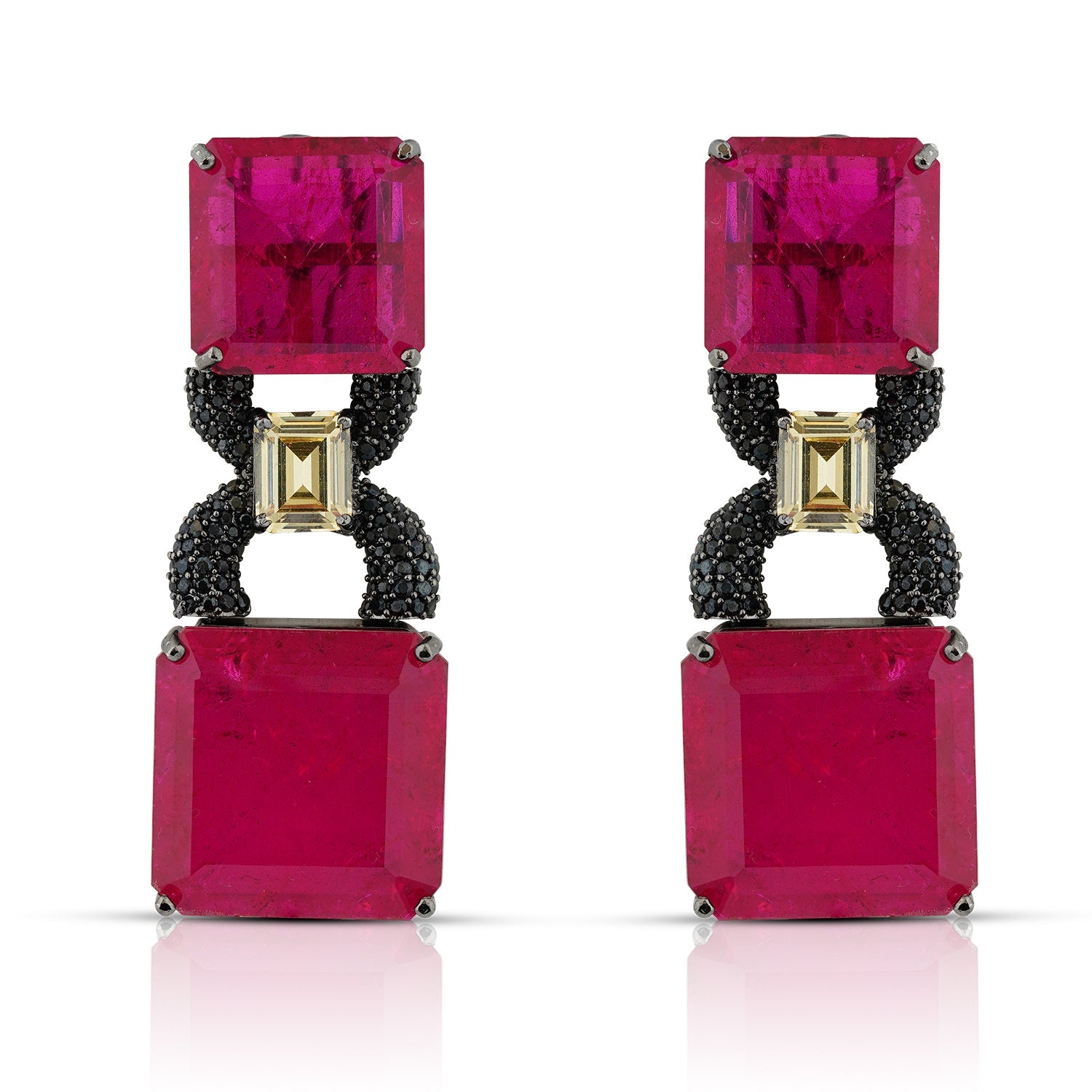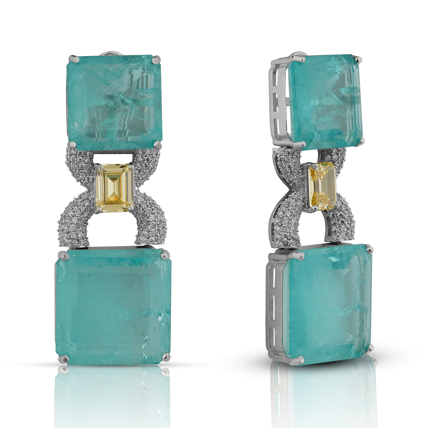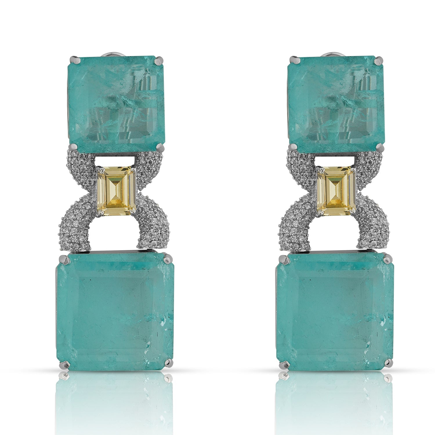 The Emily Dangle Earrings unfold like a symphony of color and contrast. Gentle aqua stones, cut in bold squares, bring with them the serenity of water and sky, while a golden emerald-cut stone glimmers in the center — a warm burst of sunlight framed in brilliance. The delicate pavé link ties the elements together, creating a balance between softness and strength.