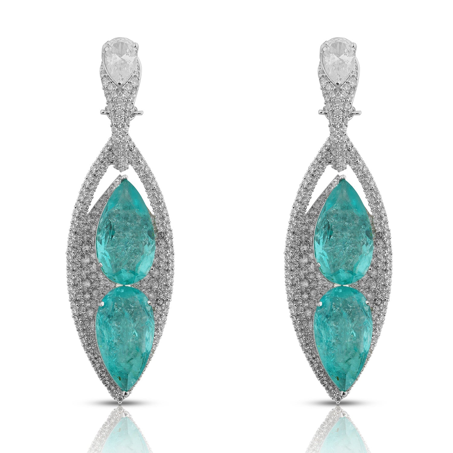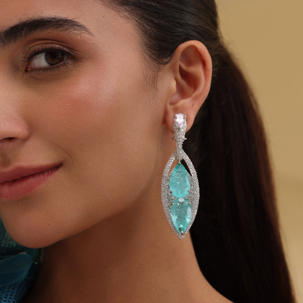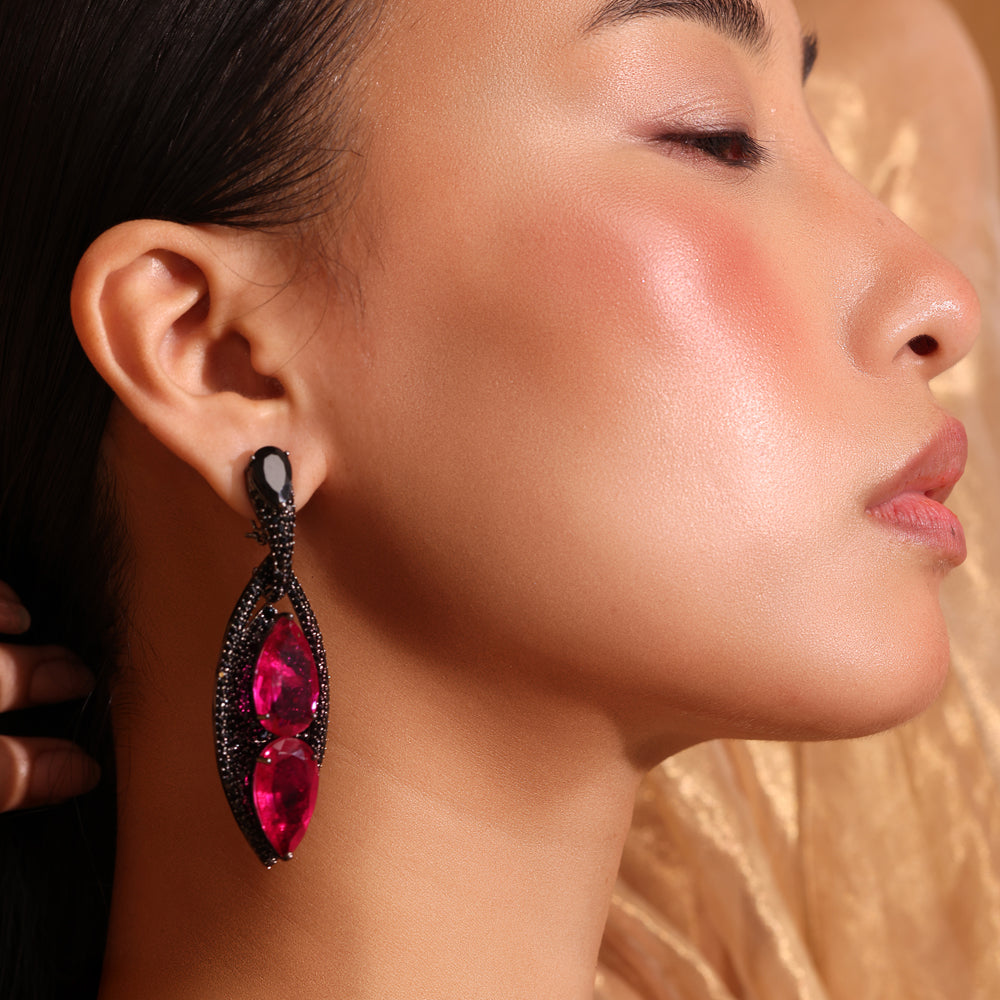 Dramatic allure takes centre stage with the Zara Dangle Earrings. Twin pear-cut rubies blaze with intensity, framed by cascades of midnight-black CZ stones that heighten their depth and fire. Suspended from a sleek onyx-hued stud, the design creates a striking play of contrast — bold yet exquisitely refined.