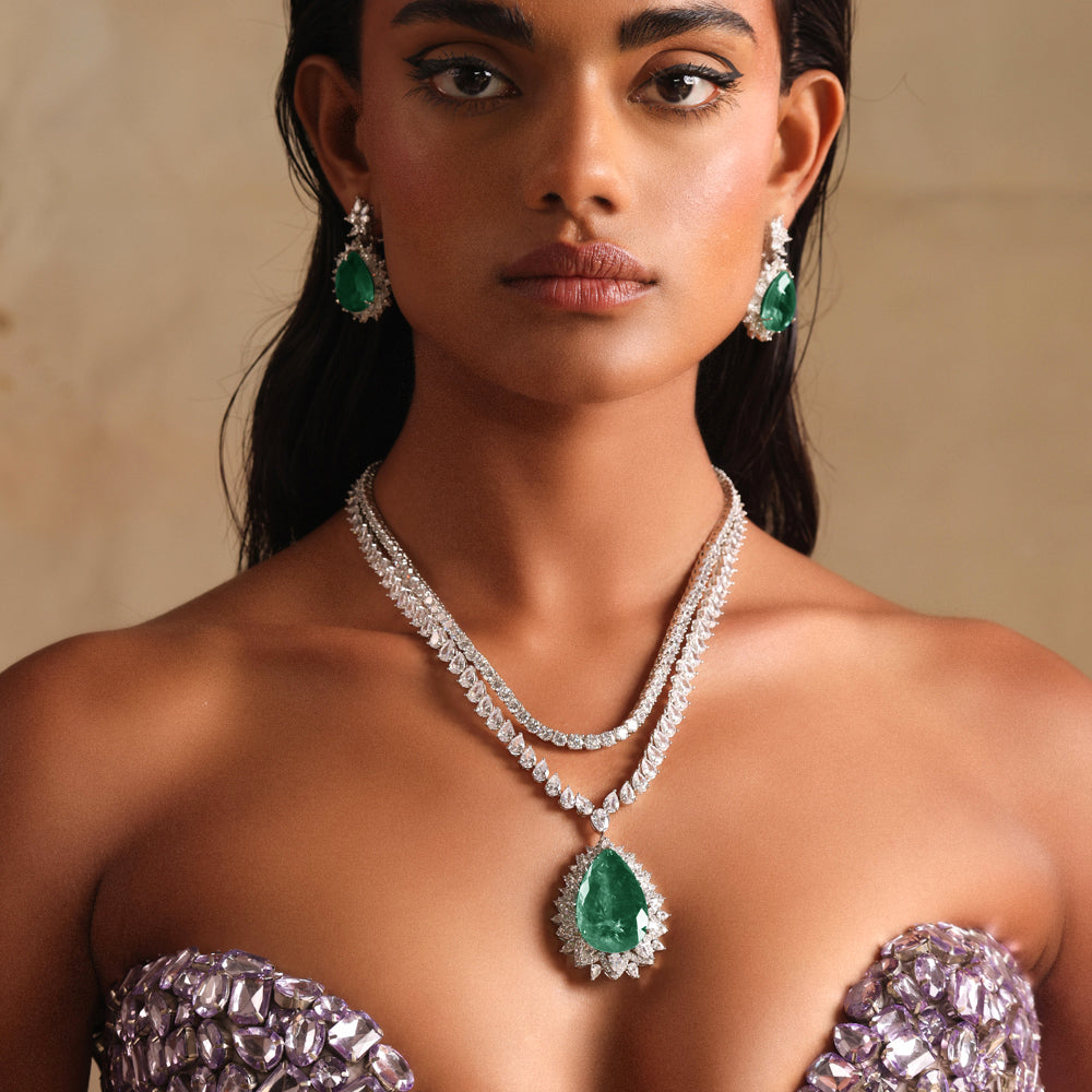 Indulge in the breathtaking charm of Laiba - a magnificent double layered cubic zirconia necklace adorned with a striking emerald green stone pendant.