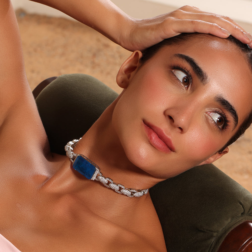 The Yaz Choker in silver redefines modern elegance. At its heart lies a vivid sapphire-hued stone, glowing with intensity and framed by a chain of CZ-studded links in gleaming rhodium. The play between the cool-toned metal and the vibrant blue creates a striking contrast that feels bold yet refined.