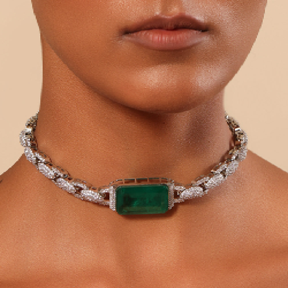 Designed to sit close to the neckline, Yaz is the kind of piece that elevates everything around it — from evening gowns to crisp tailoring. A statement in itself, it embodies strength, confidence, and timeless allure.