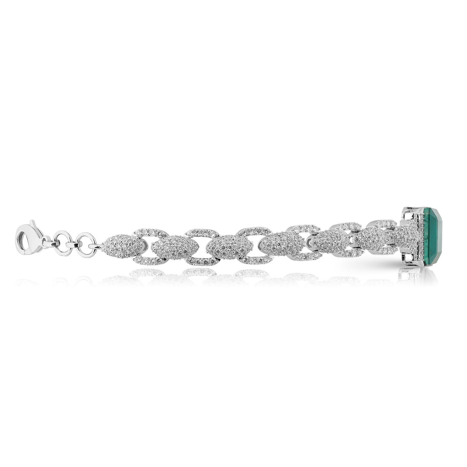 The Yaz Choker in emerald green is a bold ode to timeless beauty. At its center sits a striking rectangular emerald-hued stone, radiant with depth and character. Framed by a band of rhodium-plated links set with shimmering CZ stones, the design creates a captivating contrast between vibrant color and luminous sparkle.
