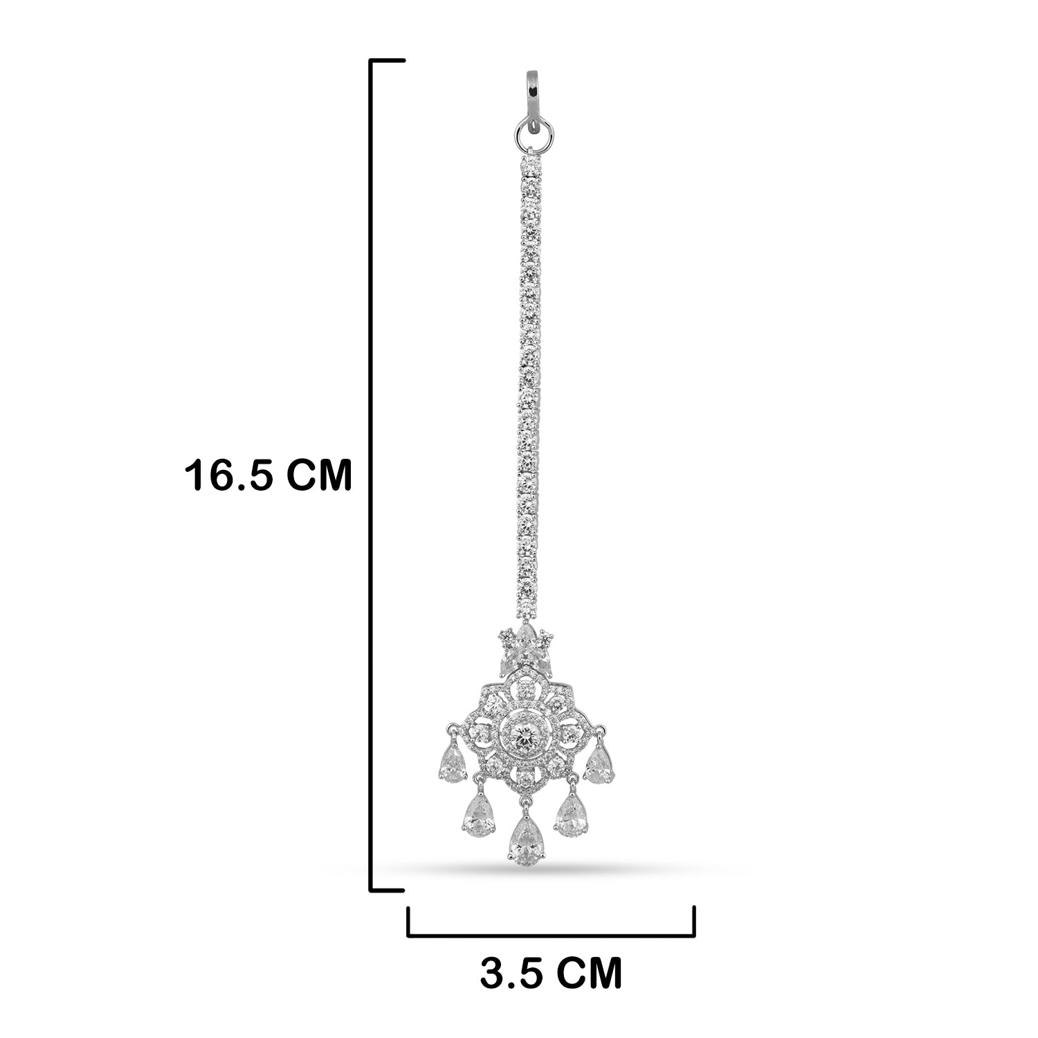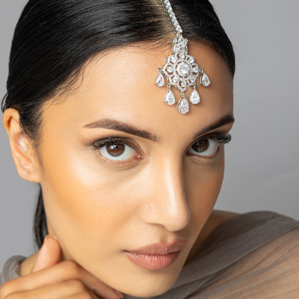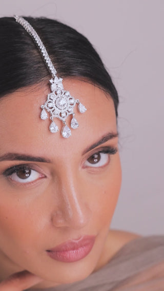 Elevate your look with Faizah, the exquisite American diamond maang tikka. This sparkling accessory adds a touch of elegance and glamour to any outfit.