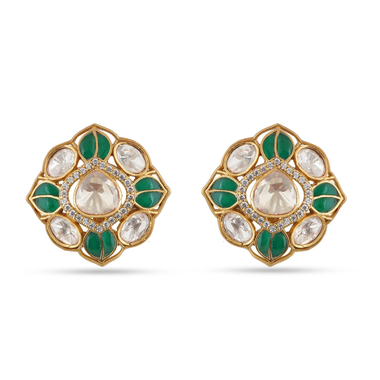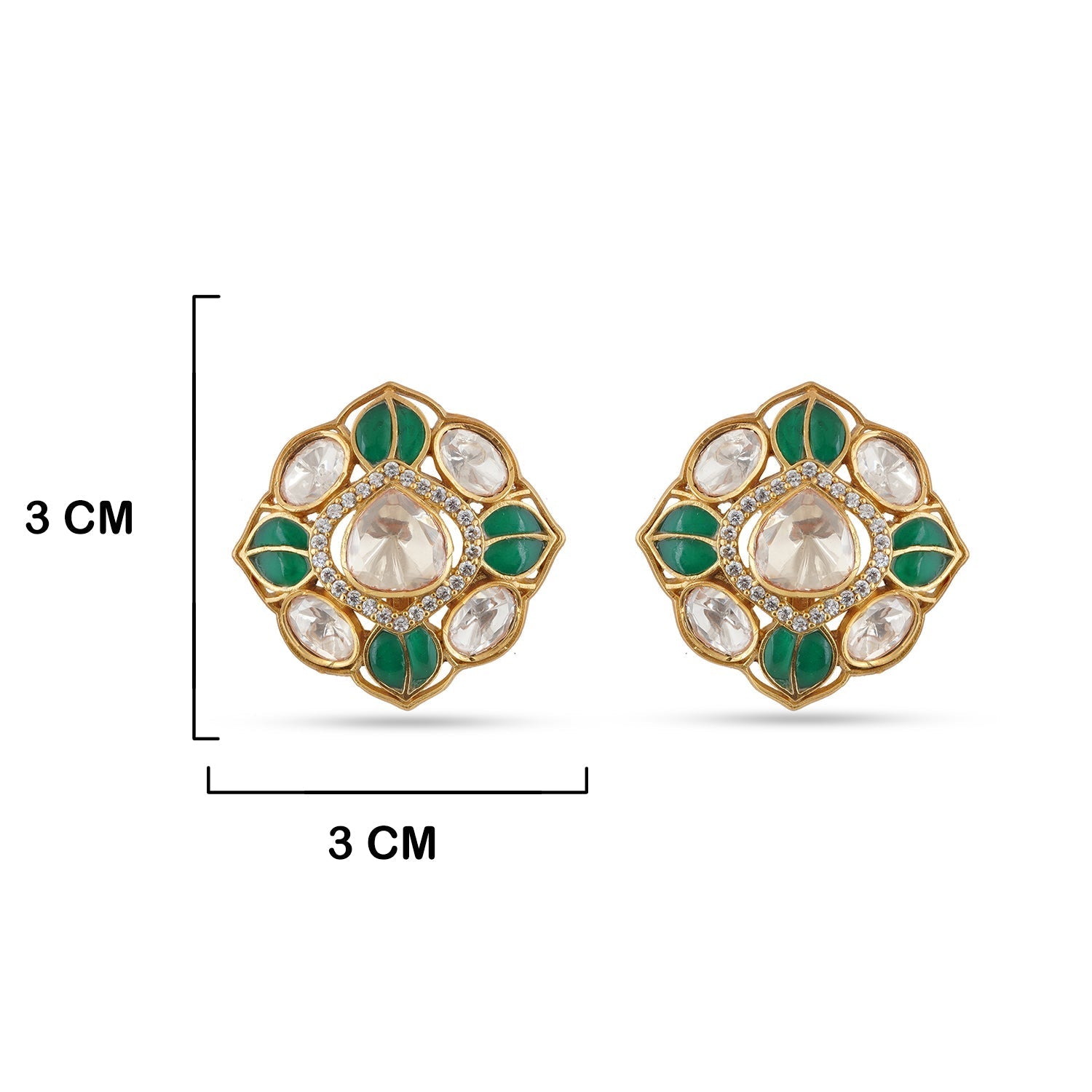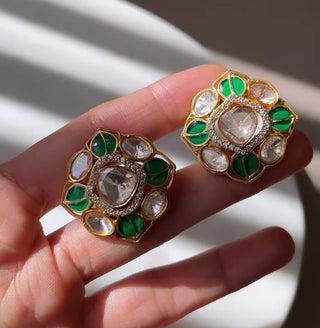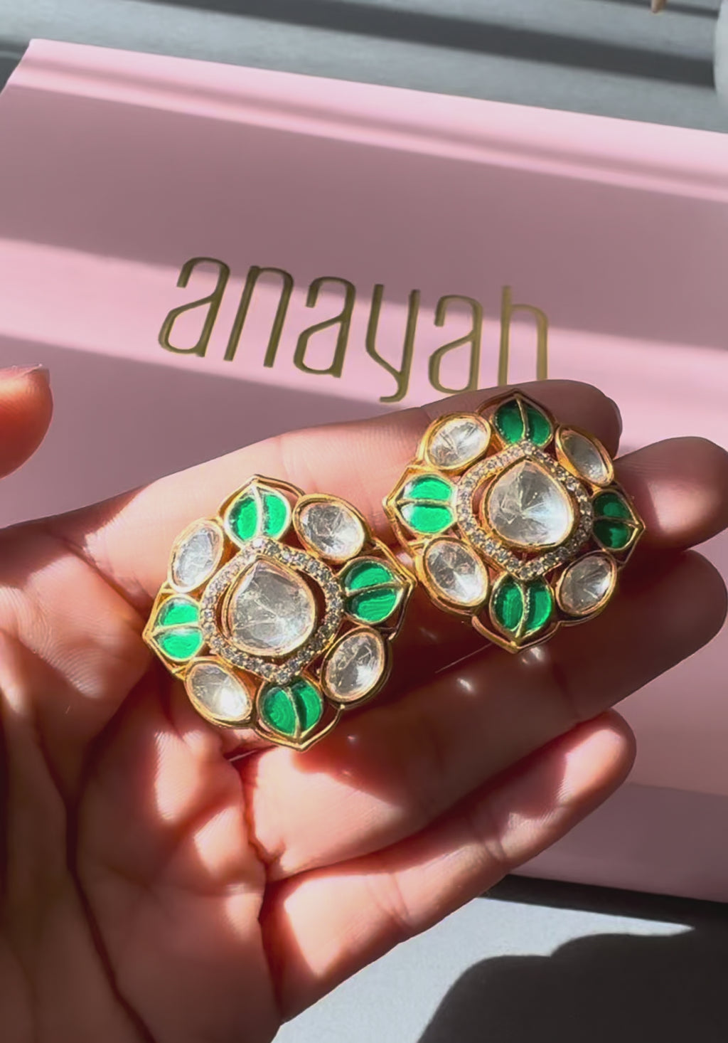 Make a statement in this stunning Asmat polki earring! With dazzling American diamonds and emerald green stones, these earrings are a perfect way to add sparkle to your wardrobe.